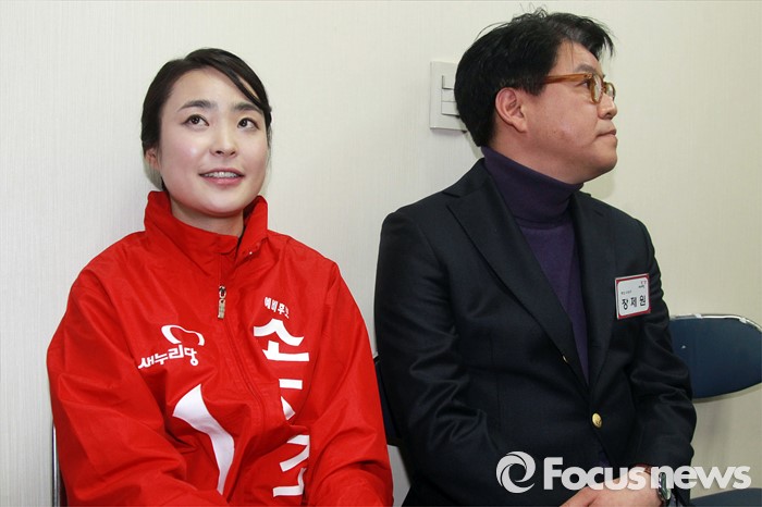 (서울=포커스뉴스) 25일 오전 서울 여의도 새누리당사에서 열린 20대 총선 공천 신청자 면접심사에 참석한 손수조(왼쪽), 장제원 부산 사상구 예비후보가 면접을 기다리고 있다.