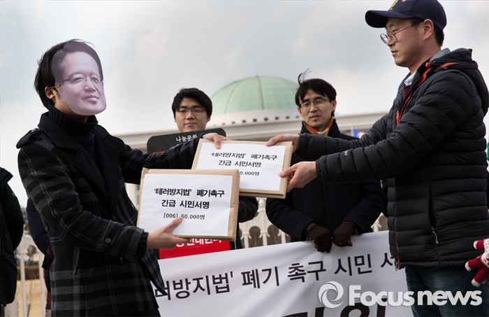 (서울=포커스뉴스) 25일 오후 서울 여의도 국회의사당 앞에서 테러방지법 제정을 반대하는 시민사회단체들이 테러방지법 폐기 촉구 시민서명 전달 퍼포먼스를 하고 있다.