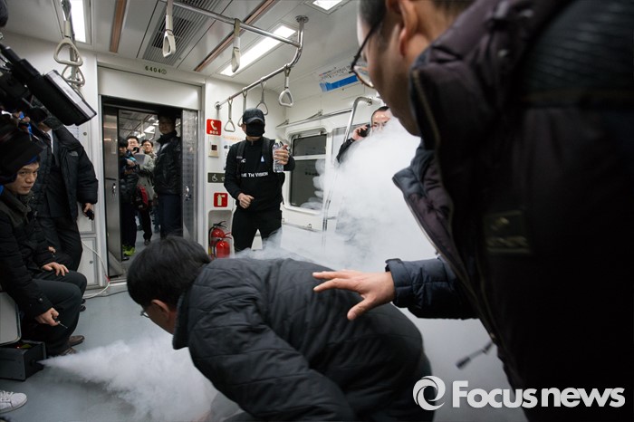 (서울=포커스뉴스) 25일 오후 서울 마포구 월드컵경기장역에서 실시한 지하철 대형사고 대응 불시 현장훈련에서 방화범역을 받은 시민이 불을 지르고 있다.