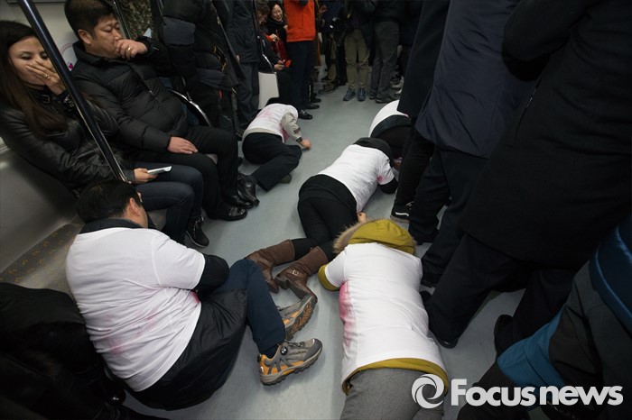(서울=포커스뉴스) 25일 오후 서울 마포구 월드컵경기장역에서 실시한 지하철 대형사고 대응 불시 현장훈련에서 승객역을 맡은 시민들이 쓰러져 있다.
