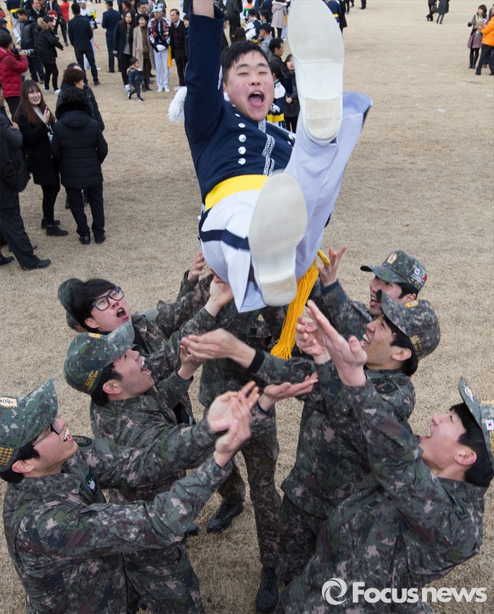 (청주=포커스뉴스) 25일 오후 충북 청주시 공군사관학교 연병장에서 열린 제64기 공군사관학교 졸업식에서 졸업생도의 친구들이 행가래를 하고 있다.