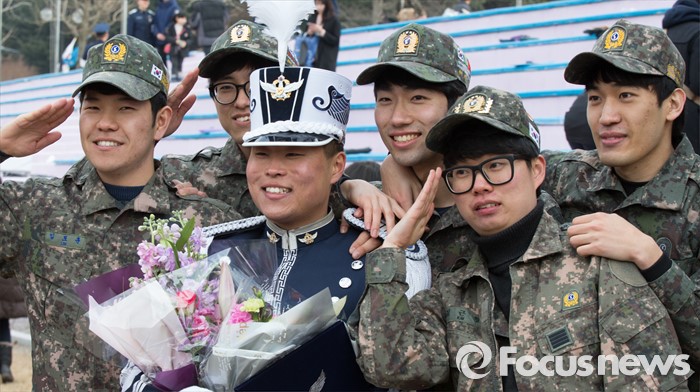 (청주=포커스뉴스) 25일 오후 충북 청주시 공군사관학교 연병장에서 열린 제64기 공군사관학교 졸업식에서 졸업생도의 친구들이 예비군복장으로 기념촬영하고 있다.