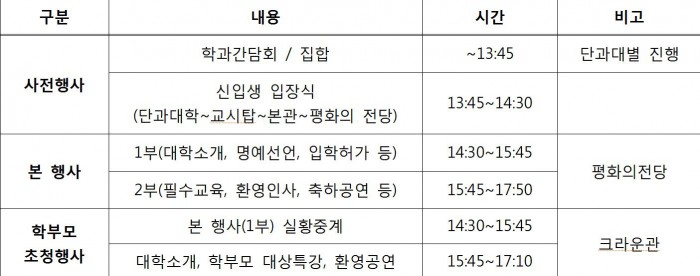 이번 입학식에서 신입생들은 각 소속 단과대학 앞에 모였다가 입학식 장소인 평화의 전당을 향해 교기를 들고 입장하는 ‘신입생 퍼레이드’를 하게 된다.