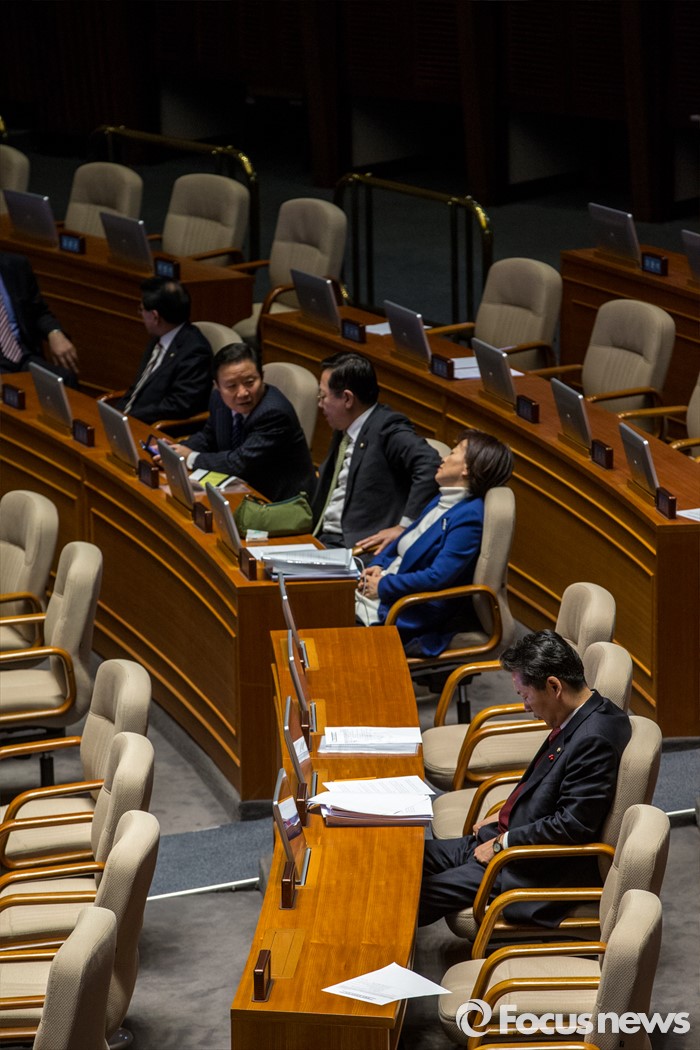 (서울=포커스뉴스) 테러방지법 직권상정에 반발해 야당의 무제한 토론(필리버스터)이 사흘째 진행되고 있는 25일 오후 서울 영등포구 국회 본회의장에서 김제남 정의당 의원 발언시간에 야당 의원들이 회의장에 자리하고 있다.