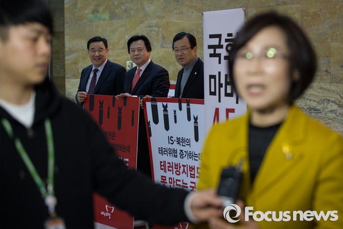 (서울=포커스뉴스) 테러방지법 직권상정에 반발해 야당의 무제한 필리버스터(무제한 토론)가 사흘째 진행되고 있는 25일 오후 서울 여의도 국회 본회의장 밖에서 토론을 마친 김제남 정의당 의원이 인터뷰를 하고 있는 가운데 테러방지법 제정에 찬성하며 시위하고 있는 여당의원들이 김 의원을 보며 웃고 있다.