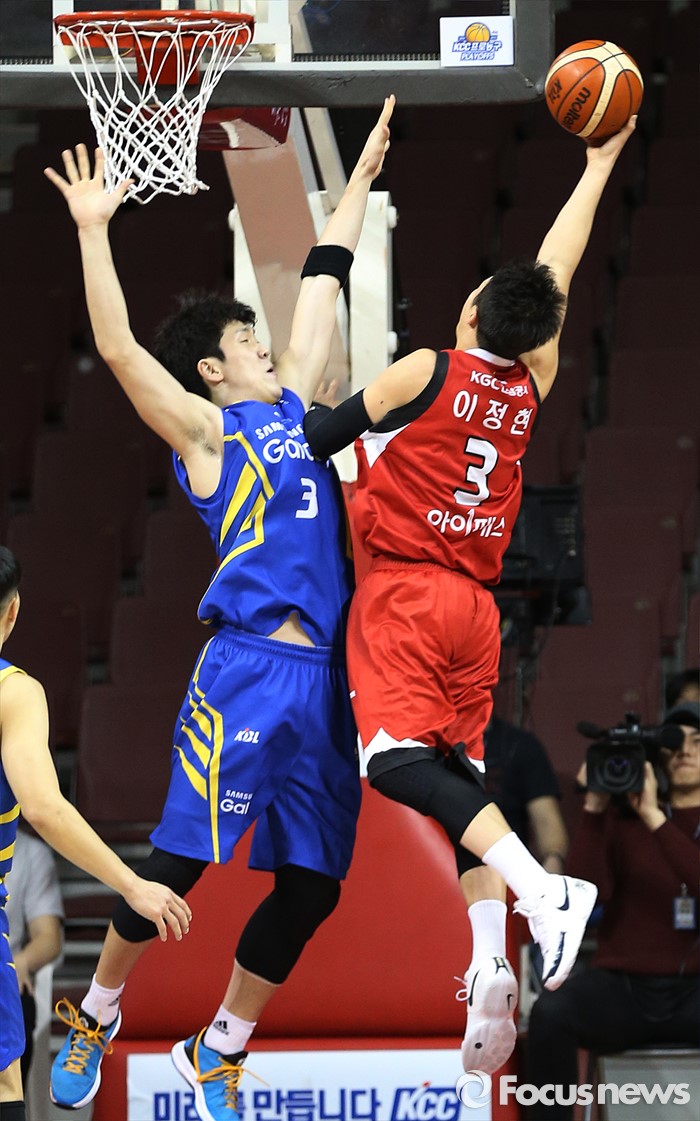 (안양=포커스뉴스) 25일 안양실내체육관에서 열린 2015-2016 프로농구 6강 플레이오프 KGC-삼성 1차전에서 KGC 이정현이 삼성 김준일의 마크를 제치며 레이업슛을 시도하고 있다.