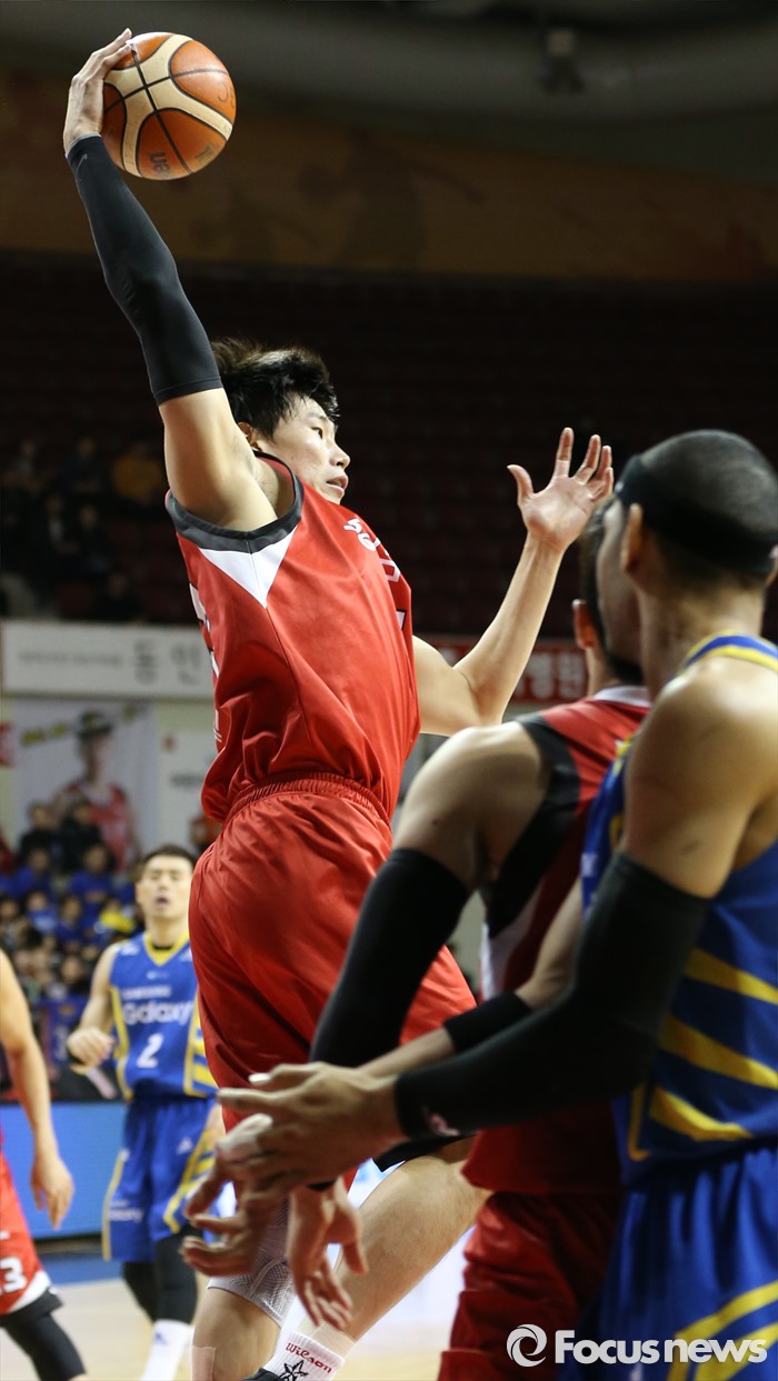 (안양=포커스뉴스) 25일 안양실내체육관에서 열린 2015-2016 프로농구 6강 플레이오프 KGC-삼성 1차전에서 KGC 오세근이 리바운드볼을 잡고 있다.