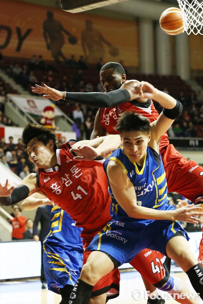 (안양=포커스뉴스) 25일 안양실내체육관에서 열린 2015-2016 프로농구 6강 플레이오프 KGC-삼성 1차전에서 KGC 오세근과 찰스 로드가 삼성 주희정의 슈팅을 저지하다 서로 엉키며 넘어지고 있다.