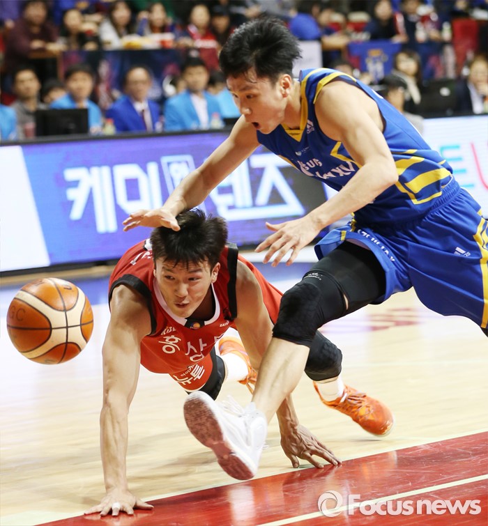 (안양=포커스뉴스) 25일 안양실내체육관에서 열린 2015-2016 프로농구 6강 플레이오프 KGC-삼성 1차전에서 KGC 박찬희가 드리블하다 넘어지자 삼성 이시준이 볼을 잡으려 달려들고 있다.