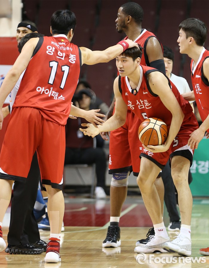 (안양=포커스뉴스) 25일 안양실내체육관에서 열린 2015-2016 프로농구 6강 플레이오프 KGC-삼성 1차전에서 KGC 양희종이 삼성 문태영과 볼 다툼에서 파울을 얻어낸 문성곤의 머리를 쓰다듬고 있다.