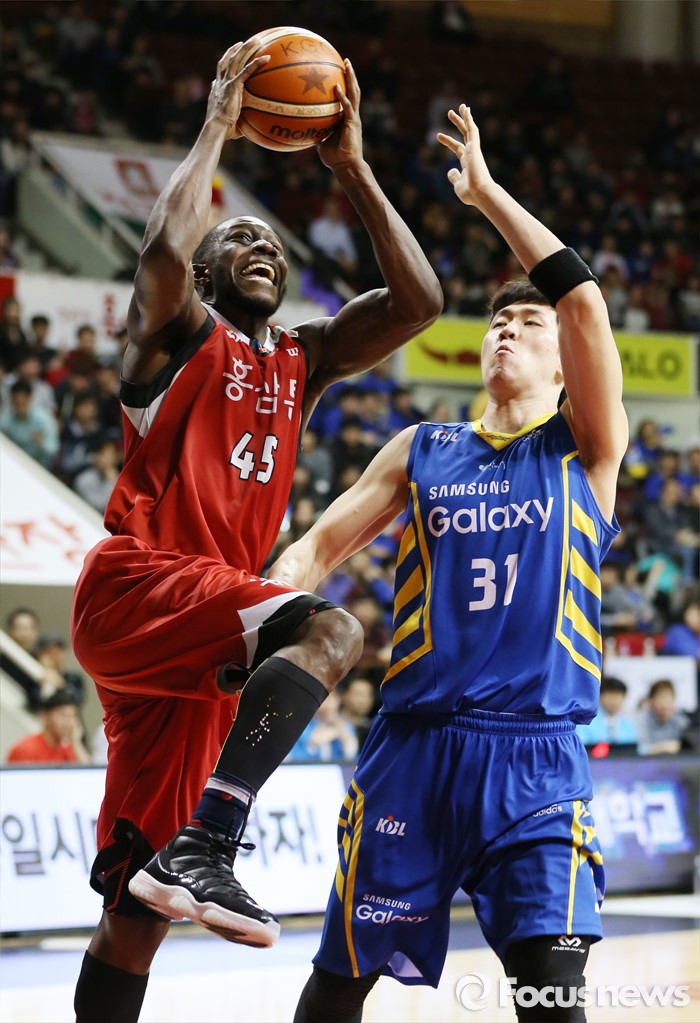 (안양=포커스뉴스) 25일 안양실내체육관에서 열린 2015-2016 프로농구 6강 플레이오프 KGC-삼성 1차전에서 KGC 마리오 리틀이 삼성 김준일의 마크를 제치며 레이업슛을 시도하고 있다.