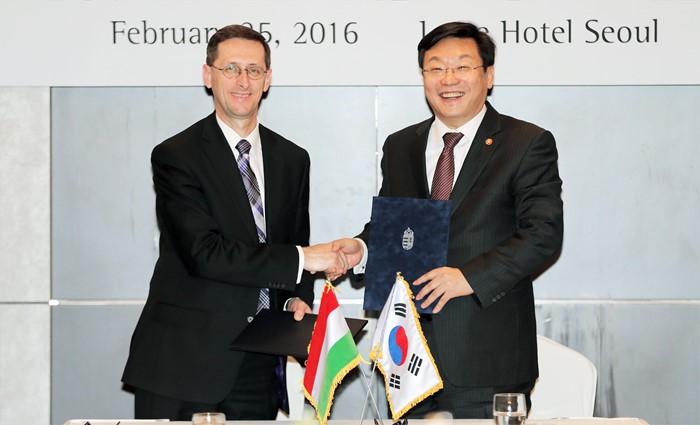 (서울=포커스뉴스) 주형환 산업통상자원부 장관(수석대표)이 25일 오후 서울 중구 소공동 롯데호텔 아스토룸에서 버르거 미하이(Varga Mihaly) 헝가리 국가경제부 장관(수석대표)과 '제2차 한-헝가리 경제공동위원회'를 갖고, 한-헝가리 양국간 무역․투자 및 중소기업 협력 확대 방안과 방위산업 및 인프라 분야 협력 확대 방안 등에 관해 의견을 교환한 후 폐회식에서 MOU 체결을 마치고 기념촬영 하고 있다. <사진제공=산업통상자원부>