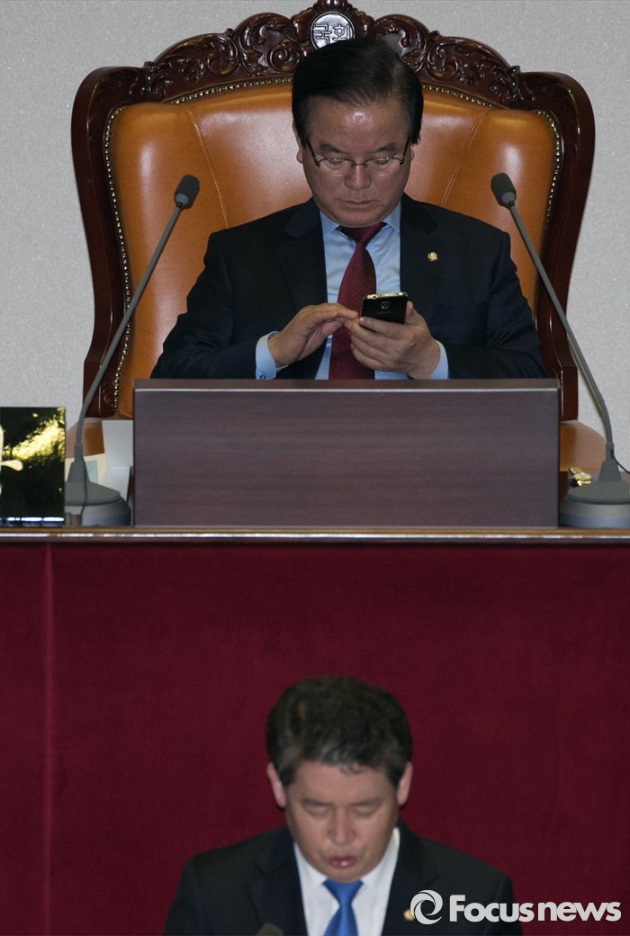 (서울=포커스뉴스) 테러방지법 직권상정에 반발해 야당의 무제한 토론(필리버스터)이 나흘째 진행되고 있는 26일 오전 서울 여의도 국회 본회의장에서 정갑윤(뒤) 국회 부의장이 핸드폰을 살펴보고 있다.