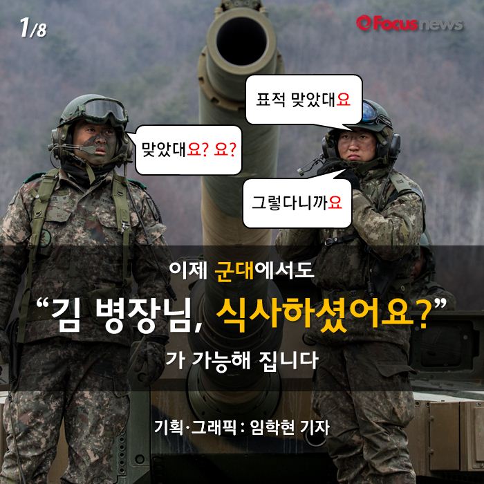 (서울=포커스뉴스) 국방부에 따르면 오는 3월1일부터 병사와 간부 모두 '해요체'를 사용하게 될 예정이라고 합니다. 그렇게 되면 한국 군대 특유의 '다나까' 어투가 사라지는 셈인데요. 국방부는 또한 지금껏 병사들이 병영에서 엄격히 지켜왔던 압존법도 앞으로는 사용하지 않게 될 것이라고 밝혔습니다. 자세한 내용을 카드뉴스로 알아보시죠.