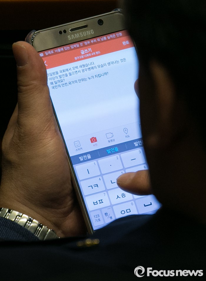 (서울=포커스뉴스) 테러방지법 직권상정에 반발해 야당의 무제한 토론(필리버스터)이 나흘째 진행되고 있는 26일 오전 서울 여의도 국회 본회의장에서 조원진 새누리당 원내수석부대표가 자신의 친목모임 SNS에 글을 남기고 있다.