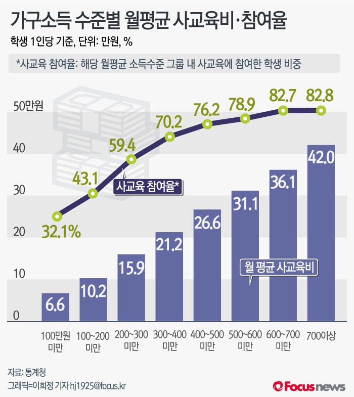(서울=포커스뉴스) 26일 통계청이 발표한 '2015년 초·중·고교 사교육비조사 결과'를 보면 지난해 월평균 소득 700만원 이상 가구의 학생 1인당 월평균 사교육비는 42만원으로 가장 높았다. 100만원 미만인 가구는 6만6000원에 불과했다. 사교육 참여율은 월평균 소득 700만원 이상 가구가 82.8%로 가장 높았고 100만원 미만인 가구의 참여율은 32.1%에 그쳤다.