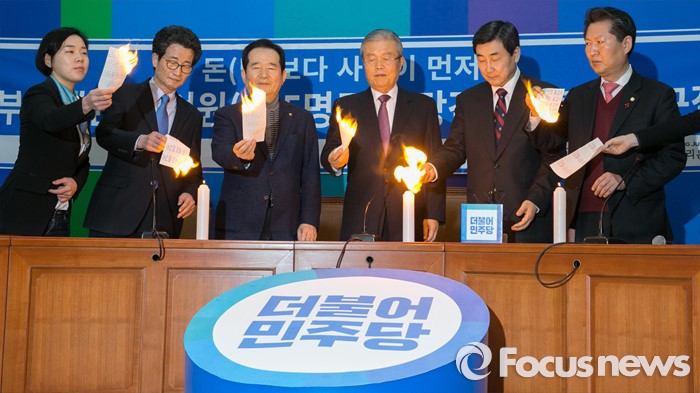 (서울=포커스뉴스) 김종인 더불어민주당 비대위 대표, 이종걸 원내대표, 이목희 정책위의장 등 참석 의원들이 26일 오전 서울 여의도 국회에서 비대위-선대위 연석회의에 앞서 부실부채 탕감 퍼포먼스를 하고 있다.