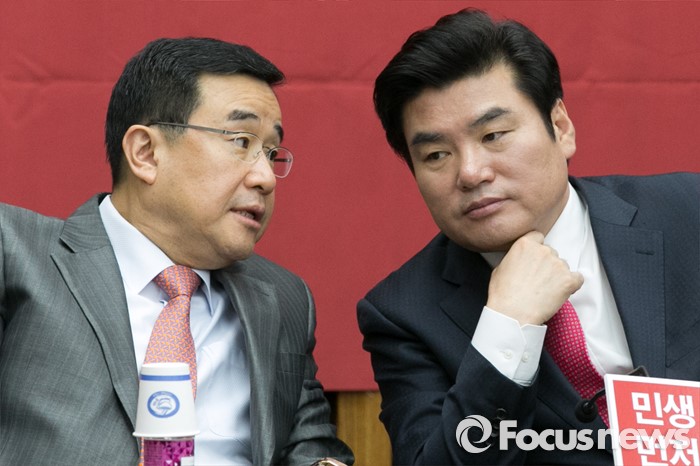 (서울=포커스뉴스) 원유철(오른쪽) 새누리당 원내대표와 김정훈 정책위의장이 26일 오전 서울 여의도 국회에서 열린 원내대책회의에 참석해 대화하고 있다.