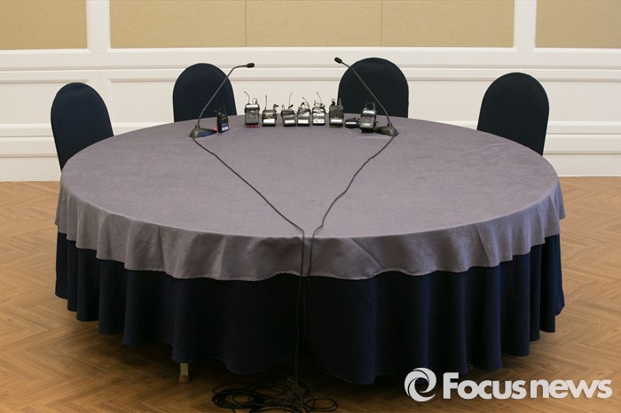 (서울=포커스뉴스) 선거구획정과 쟁점법안 논의를 위한 여·야 대표, 원내대표 2+2 회동이 무산된 26일 오전 서울 여의도 국회 귀빈식당에 취재를 위한 마이크만 놓여 있다.