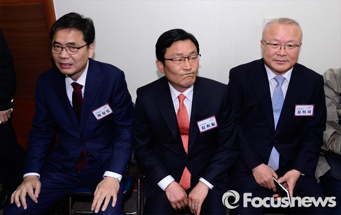 (서울=포커스뉴스) 26일 오전 서울 여의도 새누리당사에서 열린 20대 총선 공천 신청자 면접심사에 참석한 대구 중구남구 예비후보들이 면접 시작을 기다리고 있다. 왼쪽부터 곽상도, 김휘일 예비후보, 김희국 의원.