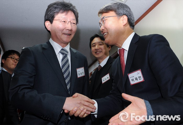 (서울=포커스뉴스) 26일 오전 서울 여의도 새누리당사에서 열린 20대 총선 공천 신청자 면접심사에 참석한 유승민(왼쪽), 이재만 대구 동구을 예비후보가 악수하고 있다.
