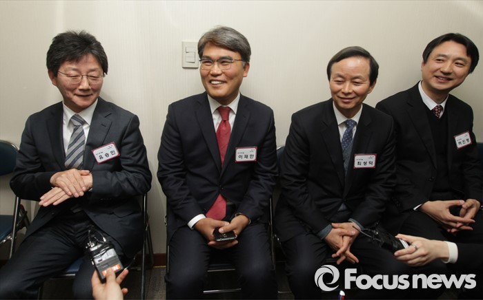 (서울=포커스뉴스) 26일 오전 서울 여의도 새누리당사에서 열린 20대 총선 공천 신청자 면접심사에 참석한 유승민(왼쪽부터), 이재만, 최성덕, 허진영 대구 동구을 예비후보가 면접을 기다리며 취재진 질문에 답하고 있다.