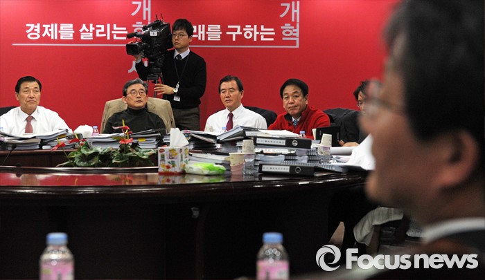 (서울=포커스뉴스) 26일 오전 서울 여의도 새누리당사에서 열린 20대 총선 공천 신청자 면접심사에 참석한 이한구(왼쪽 두번째) 공천관리위원장 등 위원들이 대구 동구을에 신청한 유승민(오른쪽 첫번째) 의원을 바라보고 있다.