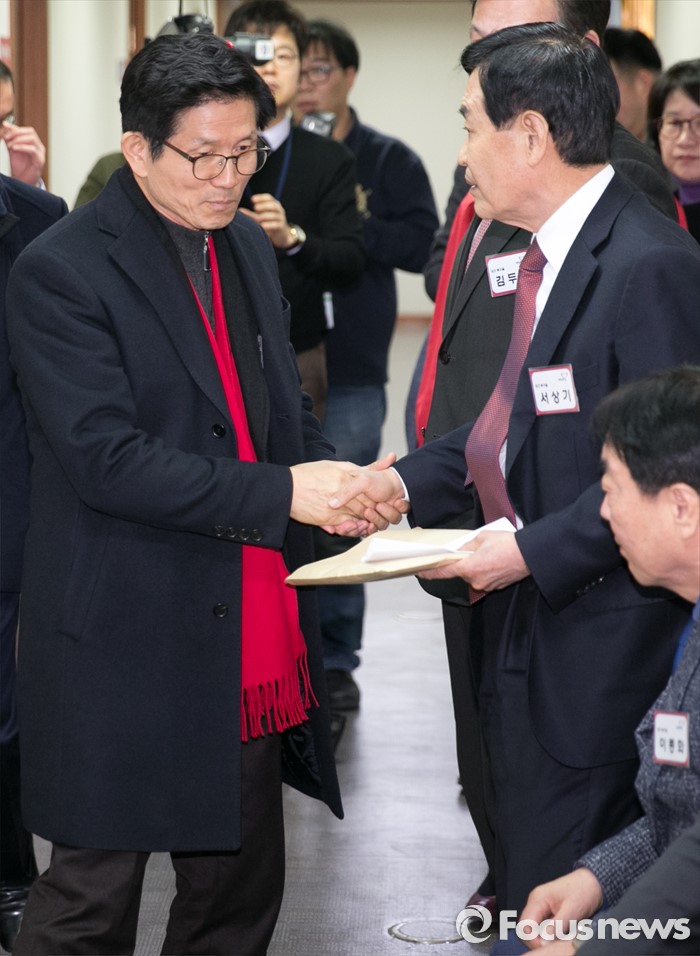 (서울=포커스뉴스) 26일 오후 서울 여의도 새누리당사에서 열린 20대 총선 공천 신청자 면접심사에 참석한 김문수(왼쪽) 대구 수성갑 예비후보와 대구 북구을에 신청한 서상기 의원이 인사하고 있다.