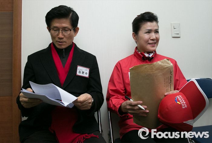 (서울=포커스뉴스) 26일 오후 서울 여의도 새누리당사에서 열린 20대 총선 공천 신청자 면접심사에 참석한 김문수(왼쪽), 안영희 대구 수성갑 예비후보가 면접을 기다리고 있다.