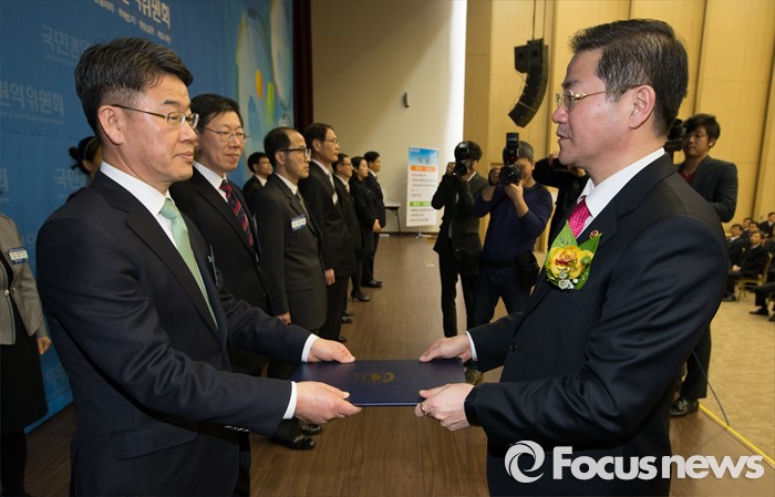(세종=포커스뉴스) 26일 오후 세종시 정부세종컨벤션센터에서 열린 제4회 국민권익의 날 기념식에서 성영훈 국민권익위원장이 유재풍 전 국민권익위원회 비상임위원에게 국민훈장동백장을 전달하고 있다.