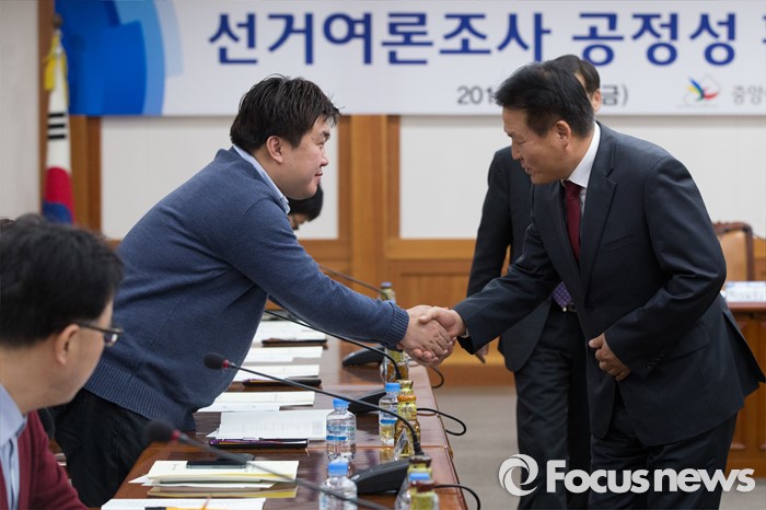 (과천=포커스뉴스) 김신기 선거정책실장이 26일 오후 경기도 과천시 중앙선거관리위원회에서 열린 선거여론조사 공정성 확보 대책회의에서 정당관계자들과 주요 여론조사업체 대표들과 인사하고 있다.