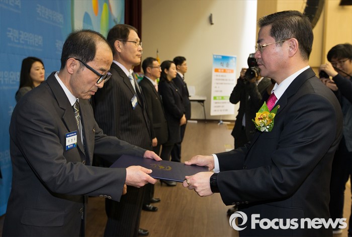 (세종=포커스뉴스) 26일 오후 세종시 정부세종컨벤션센터에서 열린 제4회 국민권익의 날 기념식에서 성영훈 국민권익위원장이 이정우 전 국민권익위원회 비상임위원에게 국민훈장석류장을 전달하고 있다.