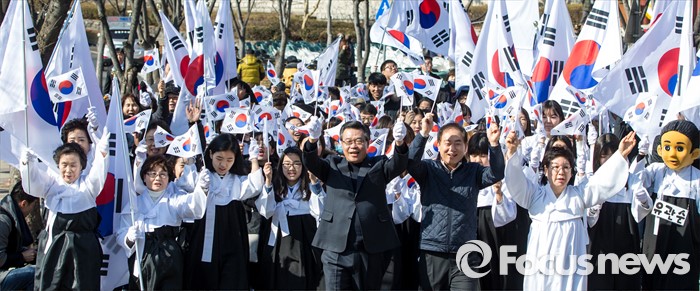 (서울=포커스뉴스) 3.1절을 나흘 앞둔 26일 오후 서울 용산구 효창공원 앞에서 열린 '나라사랑 태극기 만세 행진'에 참가한 성장현 용산구청장을 비롯한 주민들이 태극기를 흔들며 행진 하고 있다.