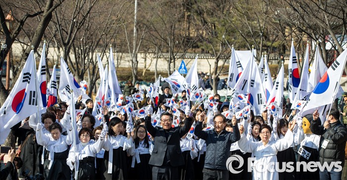 (서울=포커스뉴스) 3.1절을 나흘 앞둔 26일 오후 서울 용산구 효창공원 앞에서 열린 '나라사랑 태극기 만세 행진'에 참가한 성장현 용산구청장을 비롯한 주민들이 태극기를 흔들며 행진 하고 있다.