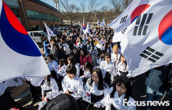 (서울=포커스뉴스) 3.1절을 나흘 앞둔 26일 오후 서울 용산구 효창공원 앞에서 열린 '나라사랑 태극기 만세 행진'에 참가한 주민들이 태극기를 흔들며 행진 하고 있다.