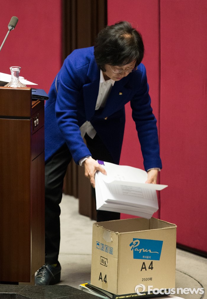 (서울=포커스뉴스) 테러방지법 직권상정에 반발해 야당의 무제한 토론(필리버스터)이 나흘째 진행되고 있는 26일 오후 서울 여의도 국회 본회의장에서 김현 더불어민주당 의원이 발언 중 자료를 정리하고 있다.