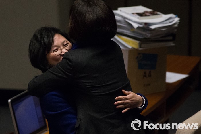 (서울=포커스뉴스) 테러방지법 직권상정에 반발해 야당이 무제한 토론(필리버스터)를 나흘째 진행하고 있는 26일 오후 서울 여의도 국회 본회의장에서 김현(왼쪽) 더불어민주당 의원이 토론을 마친 뒤 한정애 의원과 포옹하고 있다.