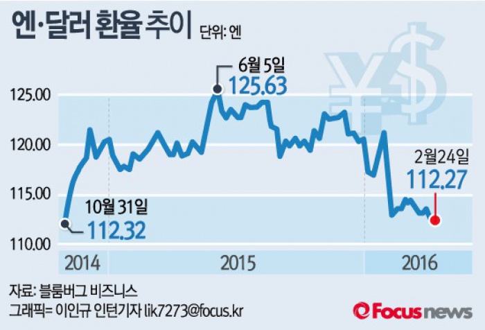 (서울=포커스뉴스) 지난달 29일 일본은행은 마이너스 금리를 도입했다. 마이너스 금리 시작 직후인 지난달 29일 도쿄 외환시장에서 달러·엔 환율은 전 거래일 대비 2.1% 하락한 121.14엔을 기록했다. 그러나 이번달 24일 달러·엔 환율은 전 거래일에 견줘 0.97원 내린 112.27원에 최종 호가됐다.