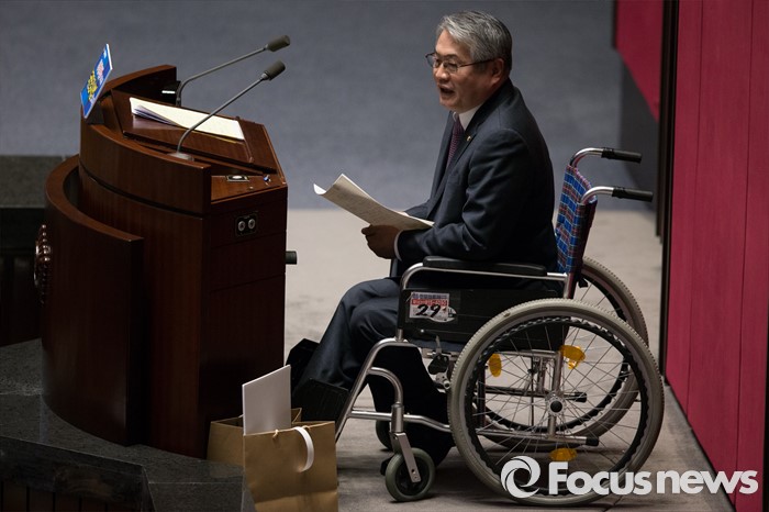 (서울=포커스뉴스) 테러방지법 직권상정에 반발해 야당의 무제한 토론(필리버스터)이 나흘째 진행되고 있는 26일 오후 서울 여의도 국회 본회의장에 13번째 필리버스터로 나선 김용익 더불어민주당 의원이 휠체어에 앉아 무제한 토론을 하고 있다.