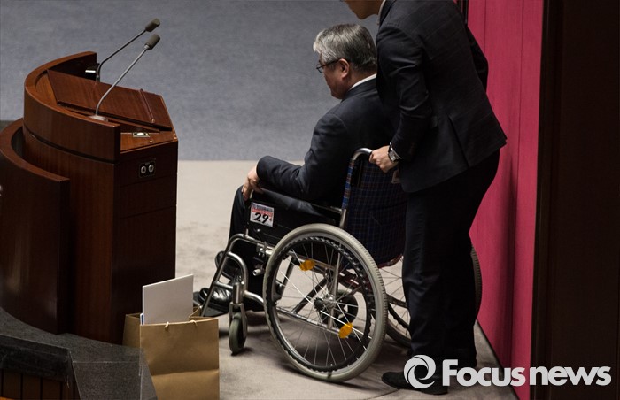 | △ 휠체어 타고 무제한 토론 나선 김용익 의원 |