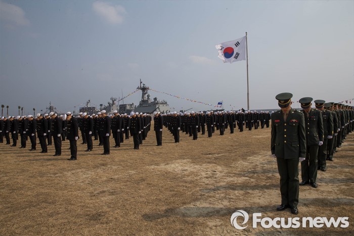 (서귀포=포커스뉴스) 26일 오후 제주 서귀포 제주해군기지에서 열린 '제주민군복합형관광미항' 준공식에서 군 장병들이 묵념을 하고 있다.