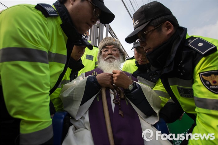 (서귀포=포커스뉴스) 문정현 신부가 26일 오전 준공식이 열리는 제주민군복합형관광미항(제주해군기지) 정문 앞 부근에서 기지 건설을 반대하며 기도를 하다 경찰 병력에 의해 들려 나가고 있다.