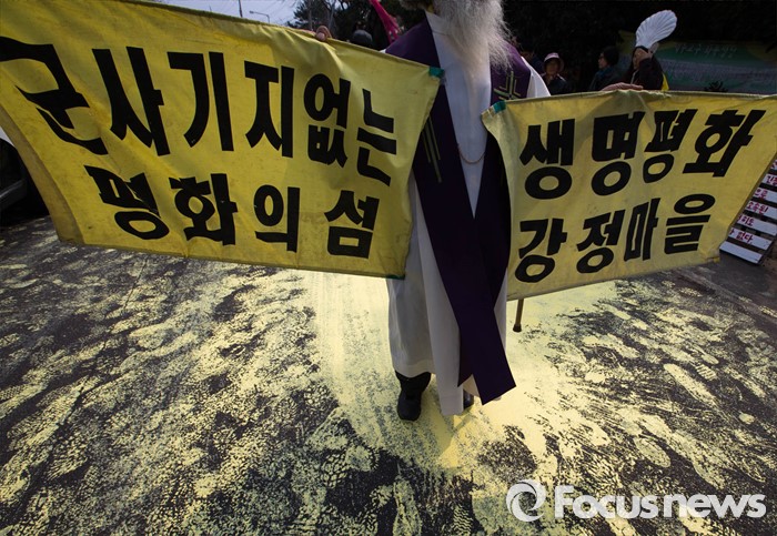 서귀포=포커스뉴스) 문정현 신부가 26일 오전 제주 서귀포시 군복합형관광미항(제주해군기지) 정문 앞 부근에서 기지건설을 반대하며 손피켓을 들고 있다.