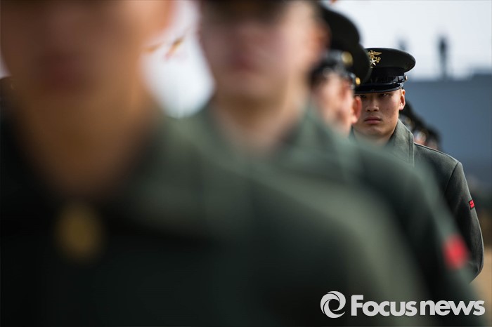 (서귀포=포커스뉴스) 26일 오후 제주 서귀포 제주해군기지에서 열린 '제주민군복합형관광미항' 준공식에 해병대 장병들이 도열해있다.