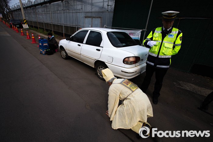 (서귀포=포커스뉴스) 26일 오전 제주 서귀포시 강정마을에서 주민들과 기지 건설을 반대하는 활동가들이 준공식이 열리는 제주 군복합형관광미항(제주해군기지) 정문 앞 부근에서 시위를 하고 있다.