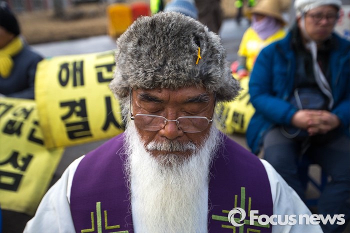 (서귀포=포커스뉴스) 문정현 신부가 26일 준공식이 열리는 제주 서귀포 제주민군복합형관광미항(제주해군기지) 정문 앞 부근에서 기지 건설을 반대하며 기도를 하고 있다.
