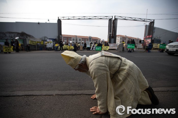 (서귀포=포커스뉴스) 26일 오전 제주 서귀포시 강정마을에서 주민들과 기지 건설을 반대하는 활동가들이 준공식이 열리는 제주 군복합형관광미항(제주해군기지) 정문 앞 부근에서 시위를 하고 있다.
