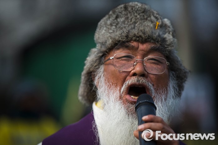 (서귀포=포커스뉴스) 문정현 신부가 26일 준공식이 열리는 제주민군복합형관광미항(제주해군기지) 정문 앞 부근에서 기지 건설을 반대하며 노래를 부르고 있다.