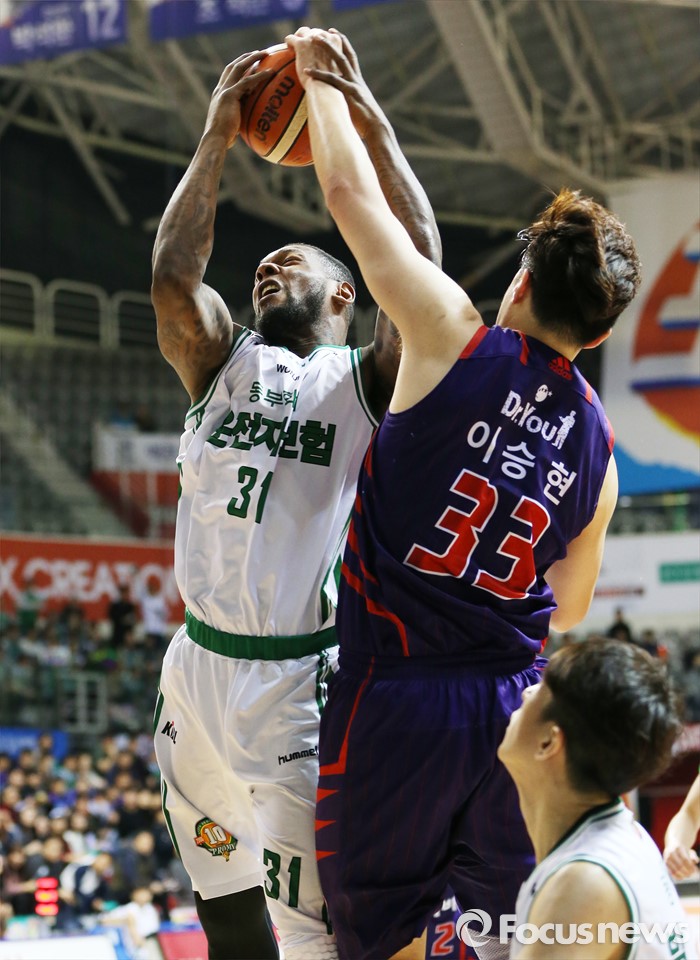 (고양=포커스뉴스) 26일 고양체육관에서 열린 2015-2016 프로농구 오리온-동부 6강 플레이오프 1차전에서 동부 맥키네스가 오리온 이승현에 앞서 리바운드 볼을 잡고 있다.