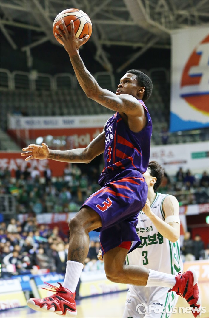 (고양=포커스뉴스) 26일 고양체육관에서 열린 2015-2016 프로농구 오리온-동부 6강 플레이오프 1차전에서 오리온 조 잭슨이허웅을 제치고 레이업슛을 시도하고 있다.
